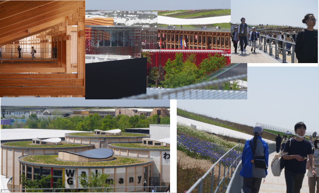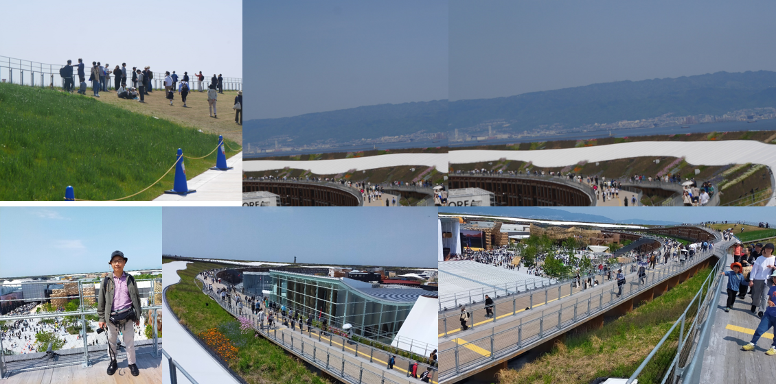 今回は予約必要や混んだパビリオンに行く気は無かったので、先ずは大屋根へ。2kmを2時間かけて、そろそろと歩いて上からパビリオンの全体や大阪の町並み、港や瀬戸内海を眺めて満足。